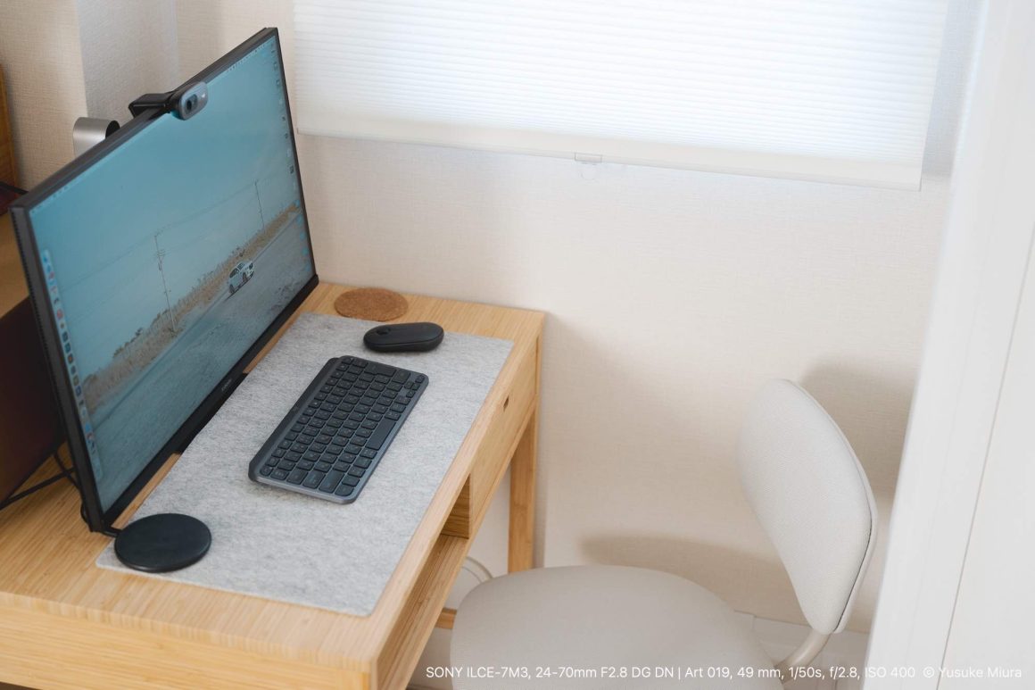 書斎では、以前FlexiSpotさんから提供していただいたスタンディングデスクをずっと使っています。このデスクは幅120cmなのですが、それに対して幅85cmのデスクマットを導入。キーボード・マウス・トラックパッドを並べても余裕があり、申し分のないサイズです。