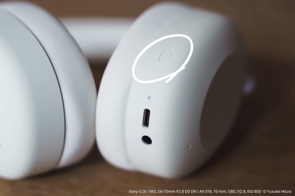 まずボタンは右側のUSB-C端子の近くにあります。写真の○で囲んだ部分です。このボタンを使って、電源のオン・オフ、そしてノイズキャンセリングのオン・オフを行います。