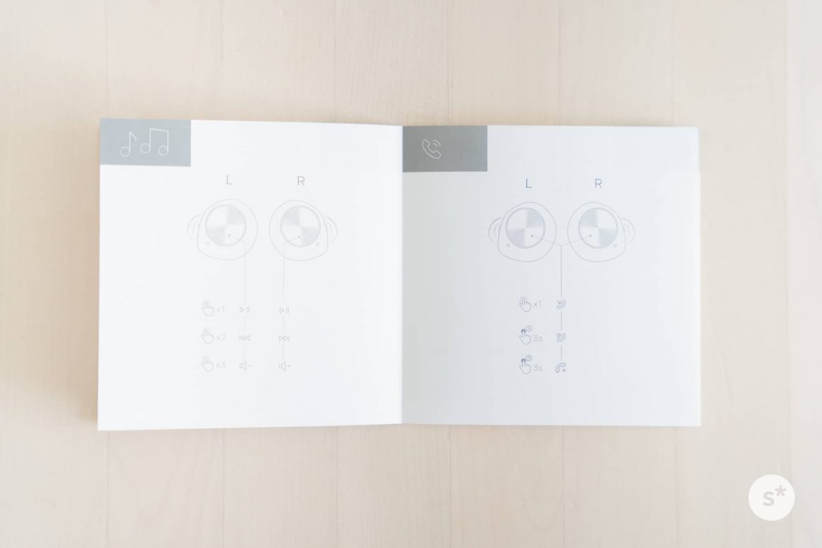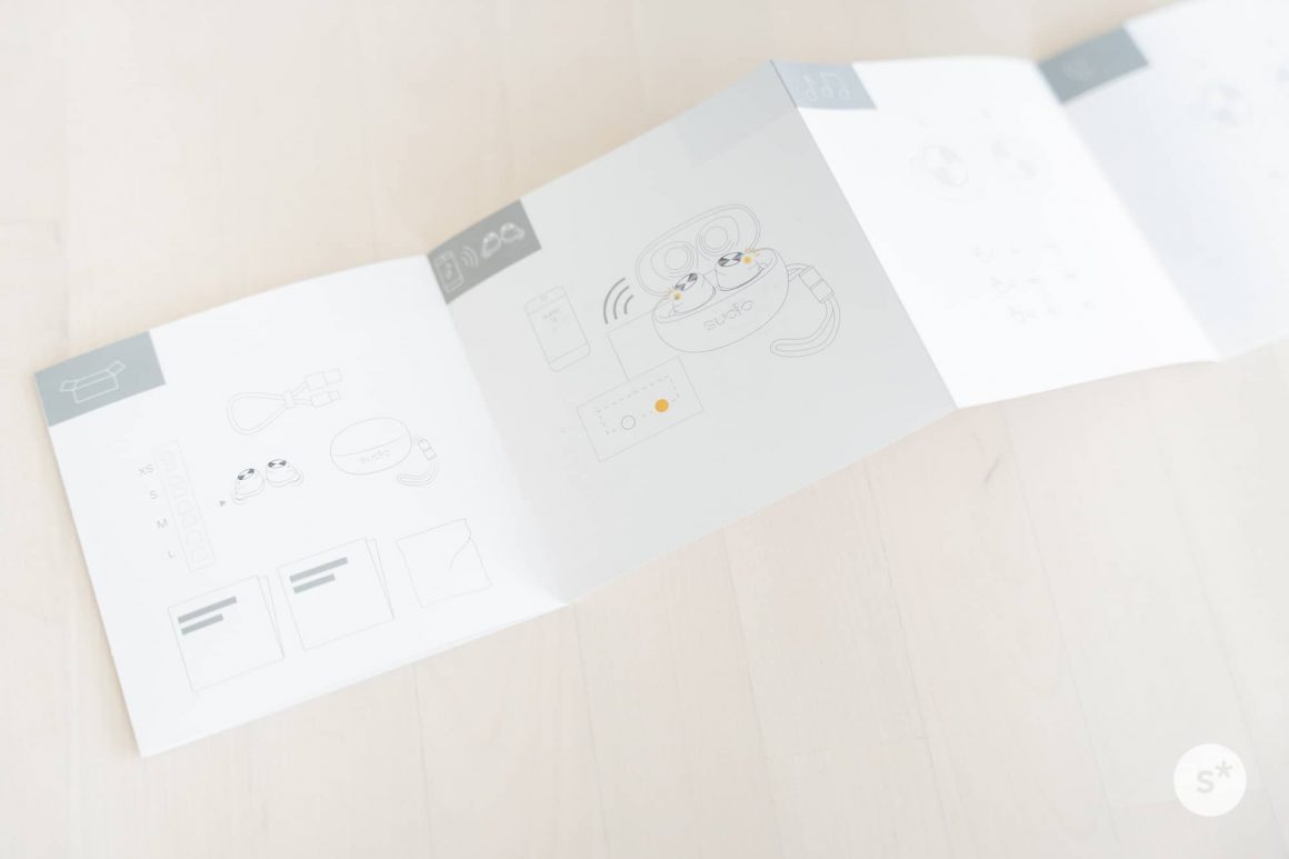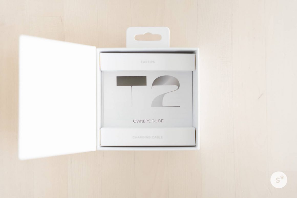 スリーブになっている外ケースを外すと、箱が開くようになっています。1段目にはSudio T2本体が、2段目にはイヤーチップ、充電ケーブル、説明書が入っています。