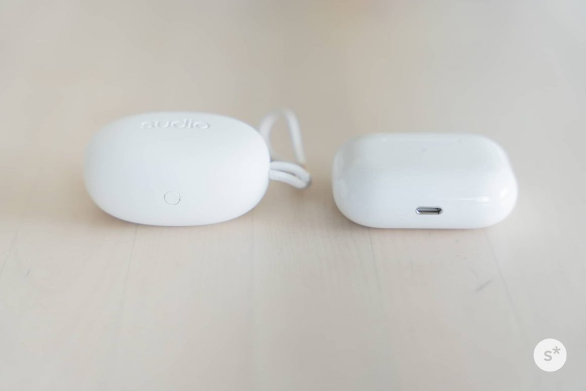 しかし、このSudio T2はAirPods Proと肩を並べるほどコンパクトです。その卵のような形のおかげで、むしろ縦横はAirPods Proよりも小さいくらい。厚みはあるものの、マットな質感と相まって、手に持った感覚はSudio T2の方が小さく感じられます。