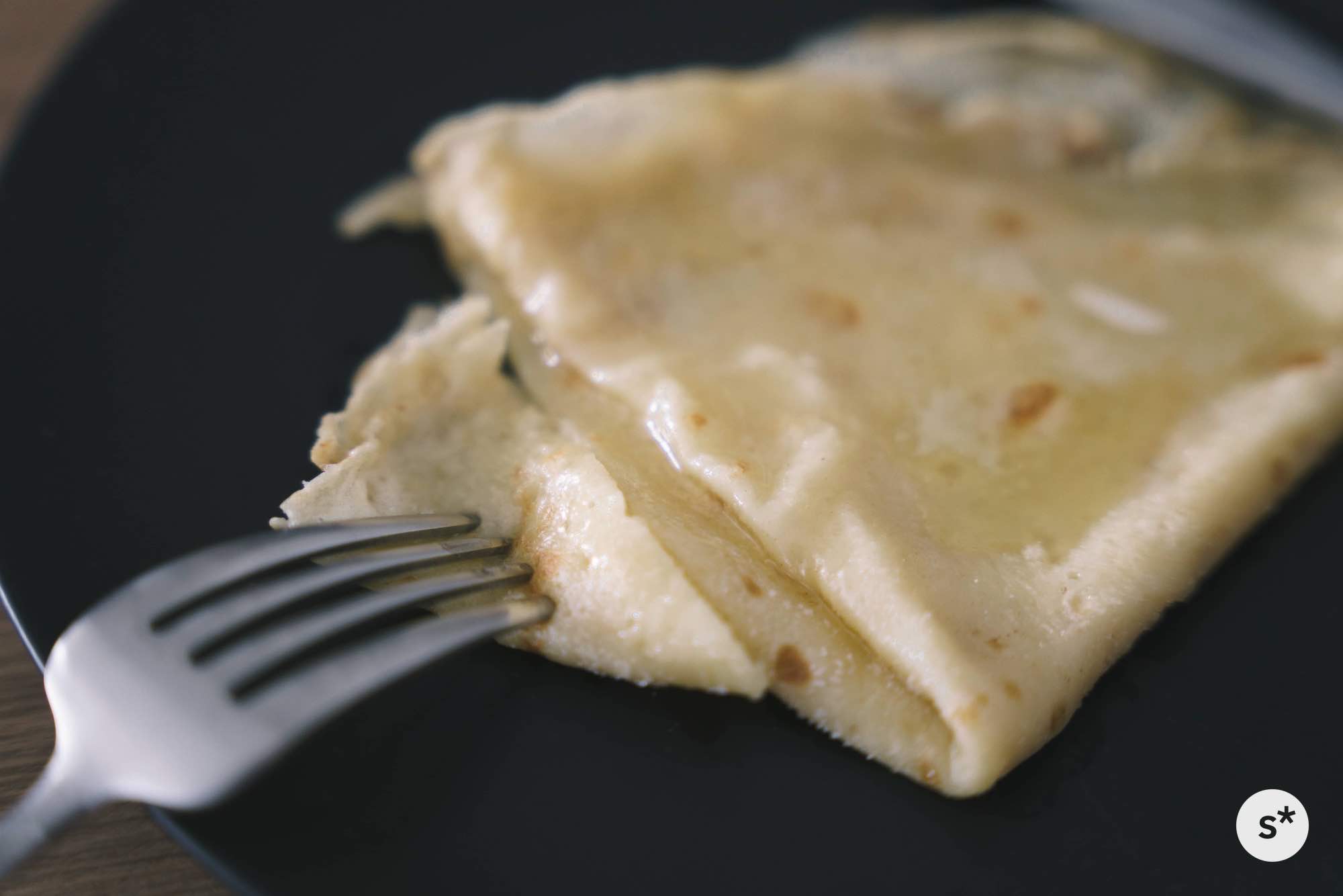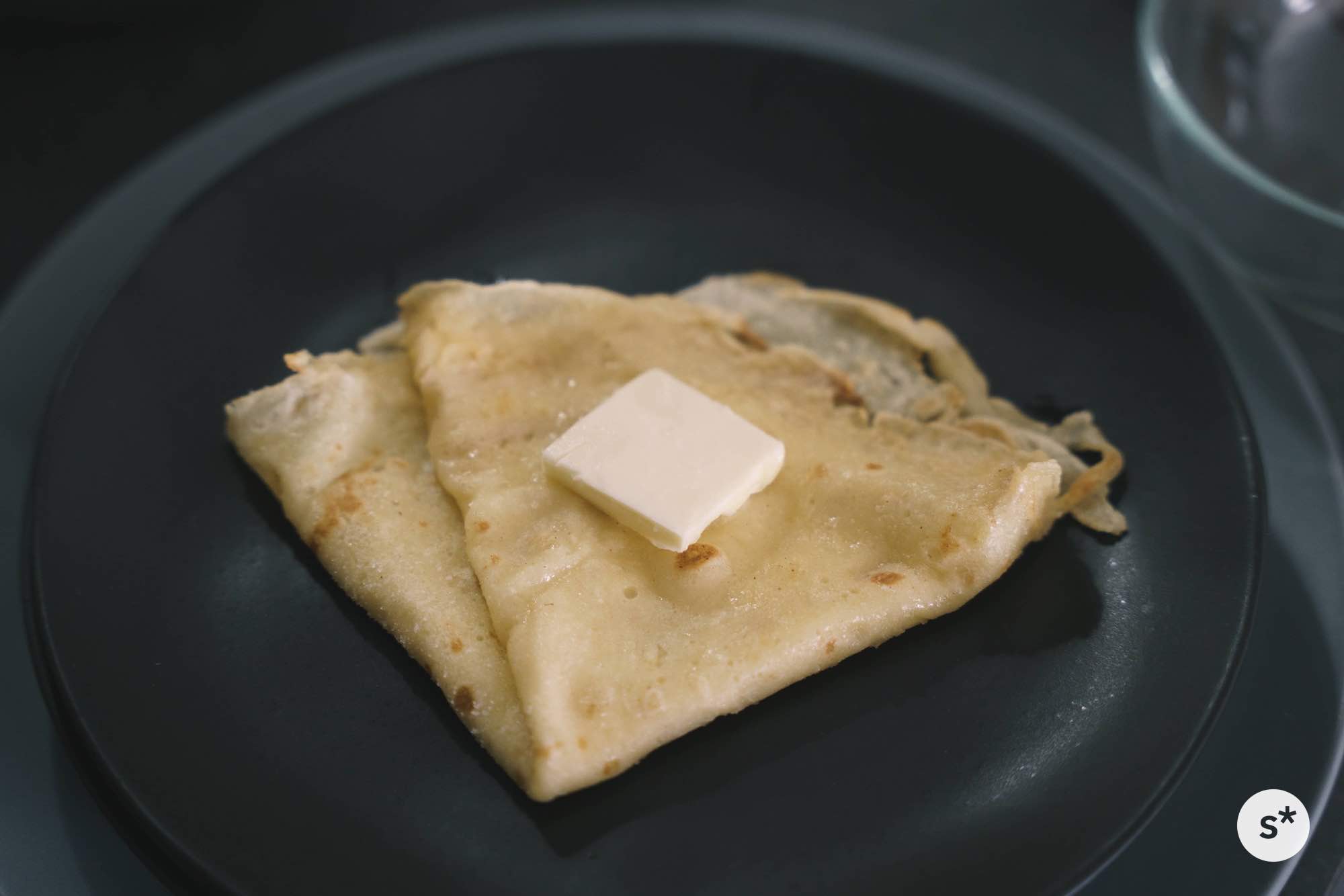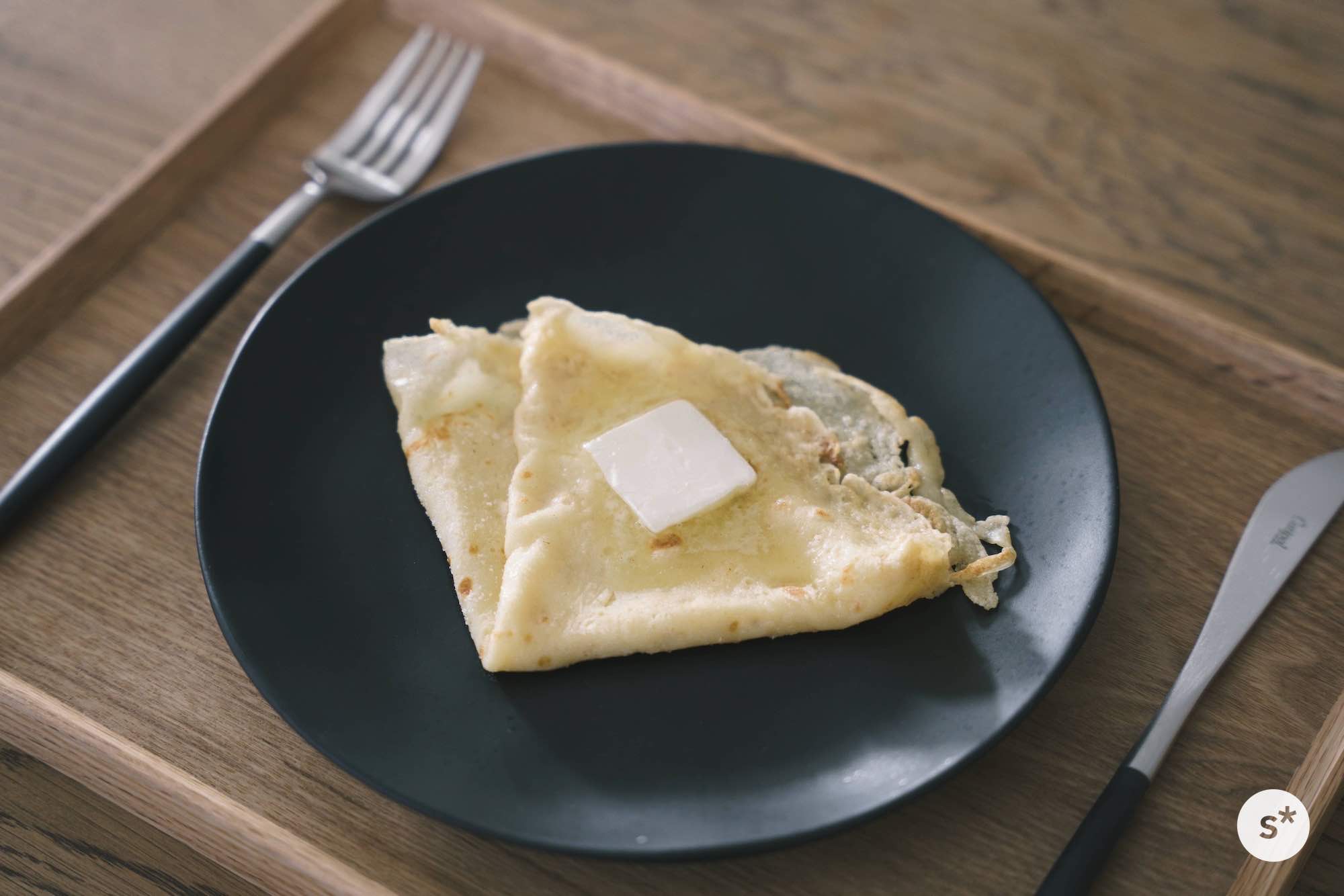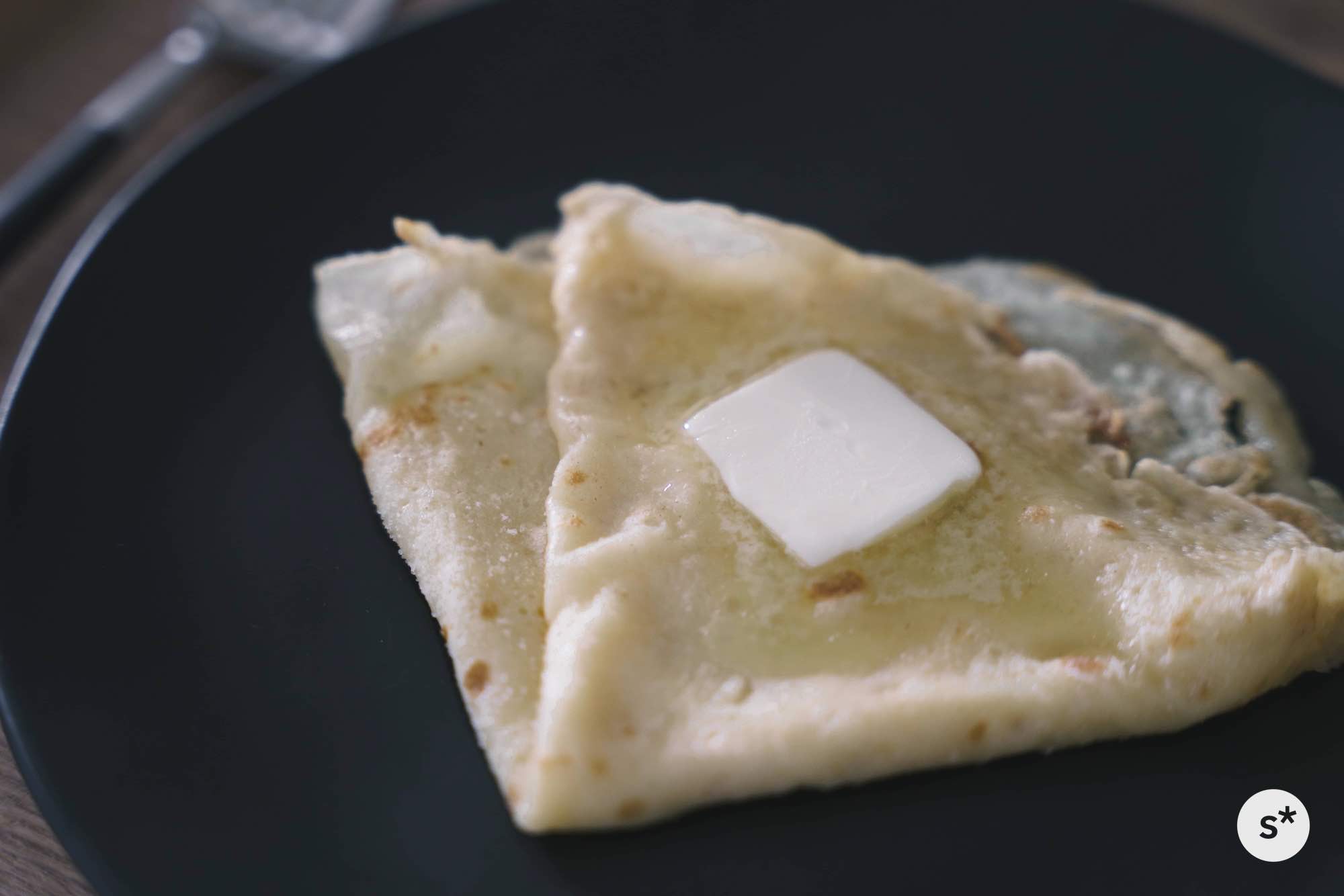 まずはシンプルにバターシュガークレープに挑戦してみます。生地を焼いてお砂糖とバターだけでいただくシンプルなものです。