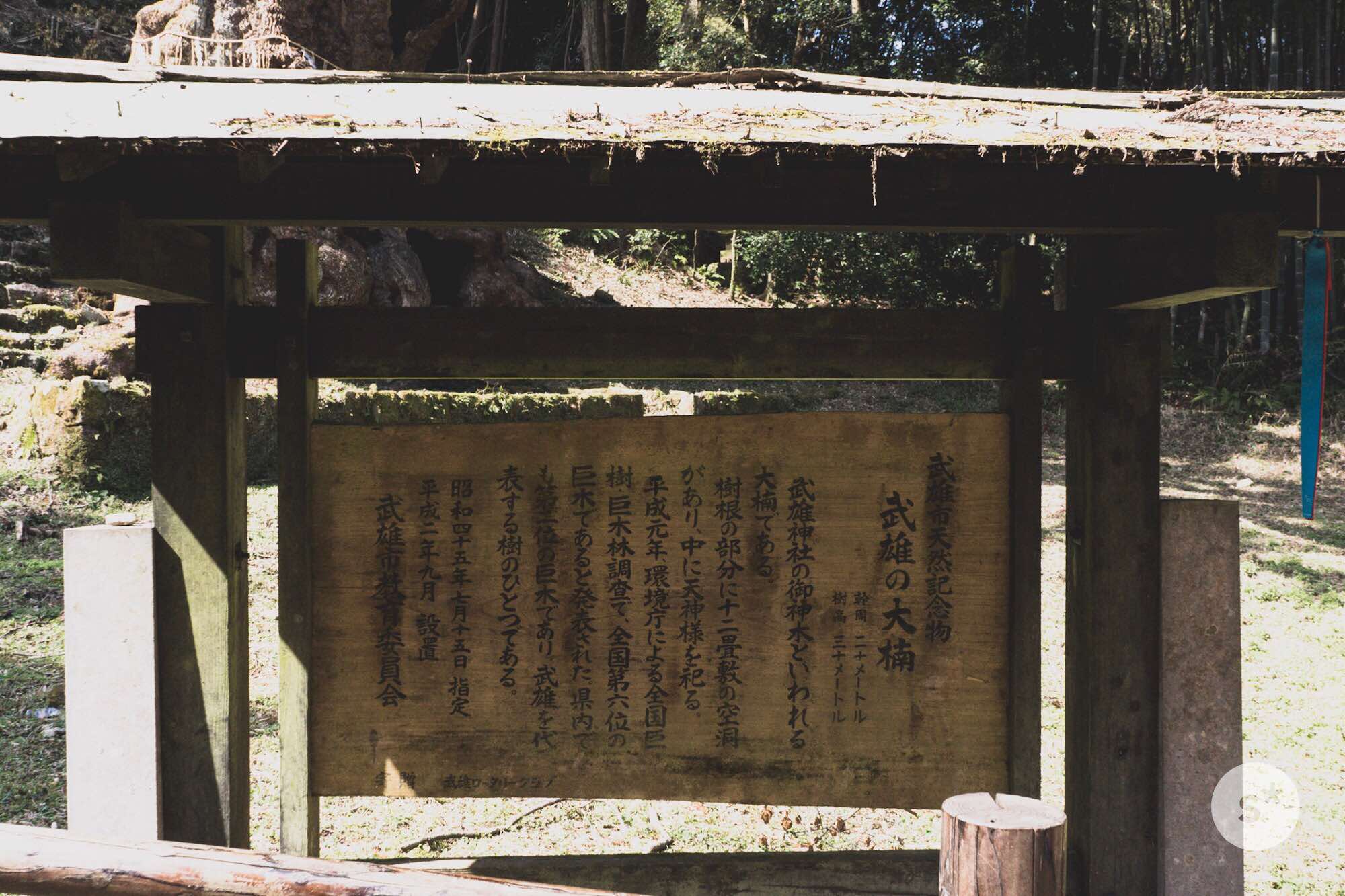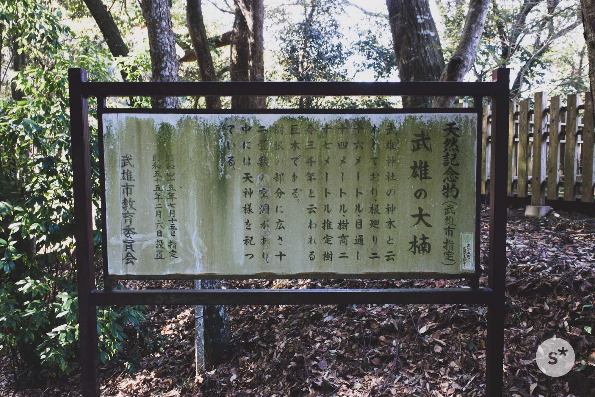 武雄神社の神木と云われており、根廻り26m、目通し14m、樹高27m、推定樹齢3000年と云われる巨木である。
