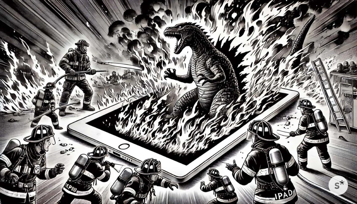本題とは全然関係ないけど、サムネイルのイラストはChatGPTにお願いして描いてもらったやつです。「燃えたぎるiPadから生まれてきた怪獣を消防隊が必死に消火する」の図。マンガのようなタッチで出力してもらいました。結構よくできたと思う。