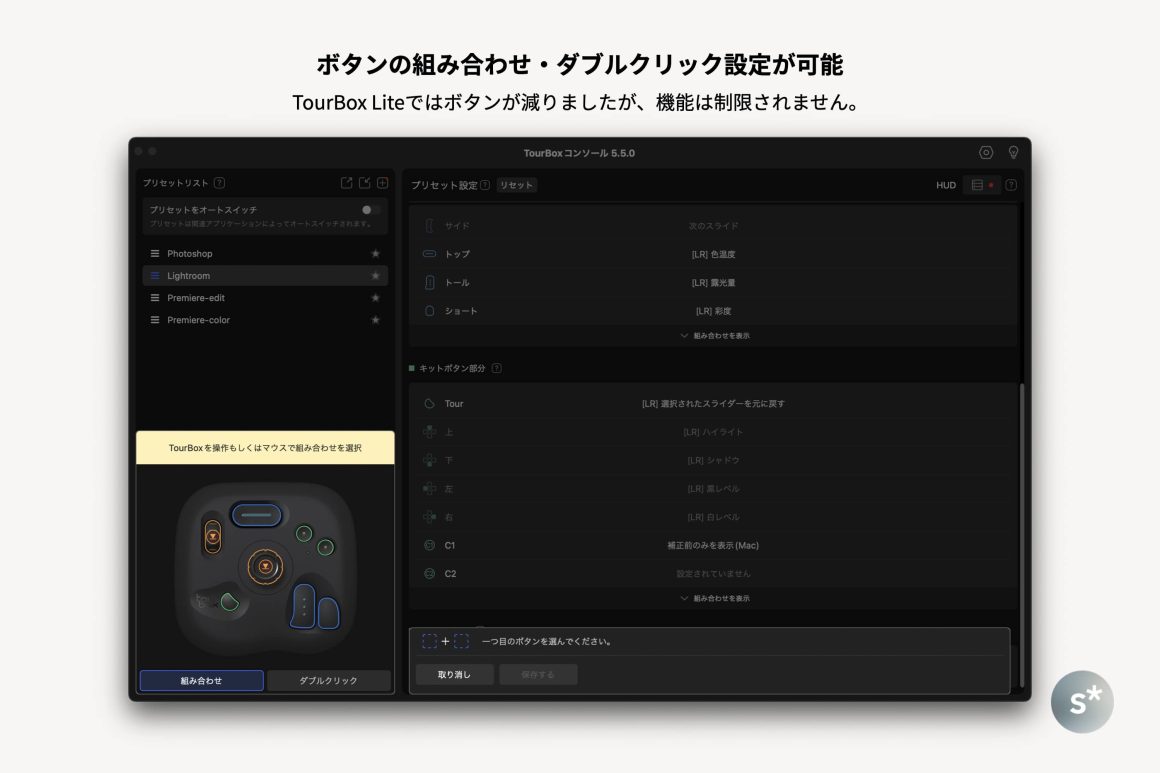 TourBoxコンソールも進化していて、最新バージョンではTourBox Lite向けにボタンの【組み合わせ】そして【ダブルクリック】の設定ができるようになりました。