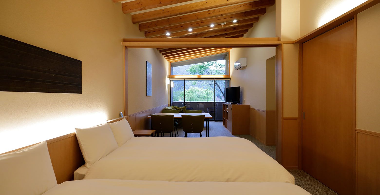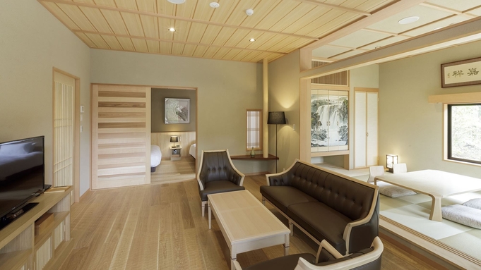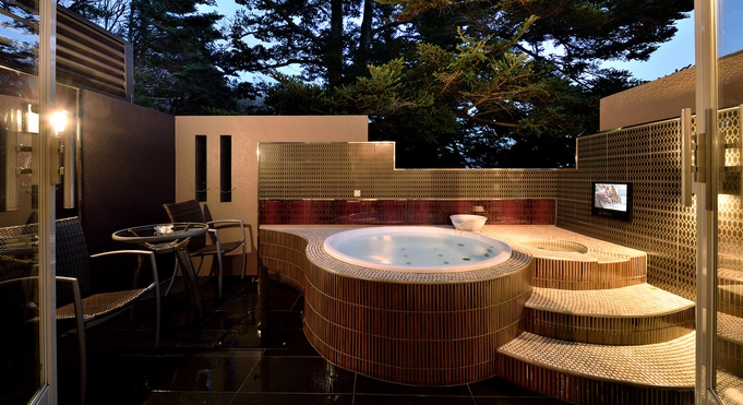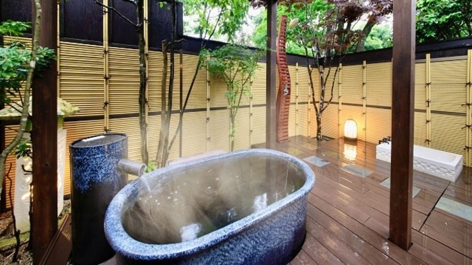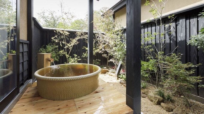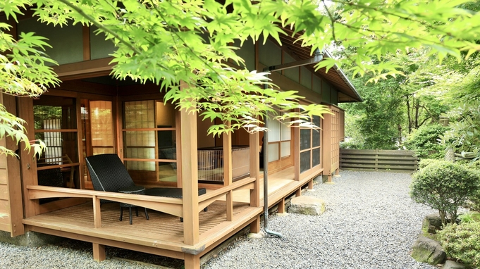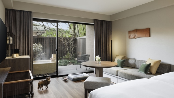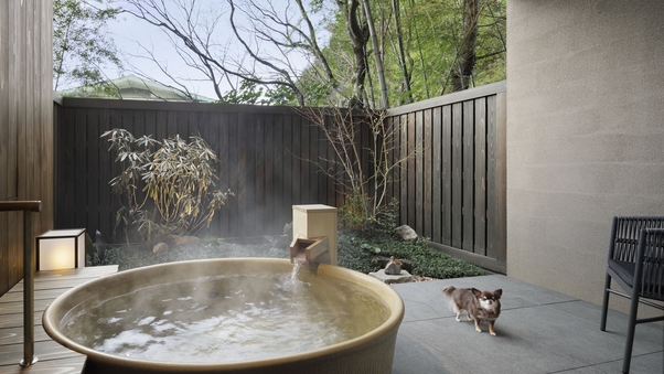 全ての客室にかけ流しでお愉しみいただける露天温泉をご用意しており、お食事は一流料亭の流れをくむ本格創作日本料理をお部屋にてご堪能いただけます。愛犬も一緒にご家族でお部屋にてゆっくりとおくつろぎいただけます。