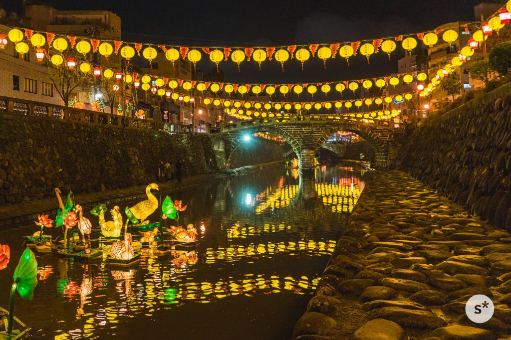 もともとは中華街の華僑の方々でこじんまりとやっていた行事だったのが、今や長崎の街全体を彩るイベントになりました。新地中華街周辺を中心に、駅も道もアーケードもお寺も川の上も、一面のランタンに照らされます。