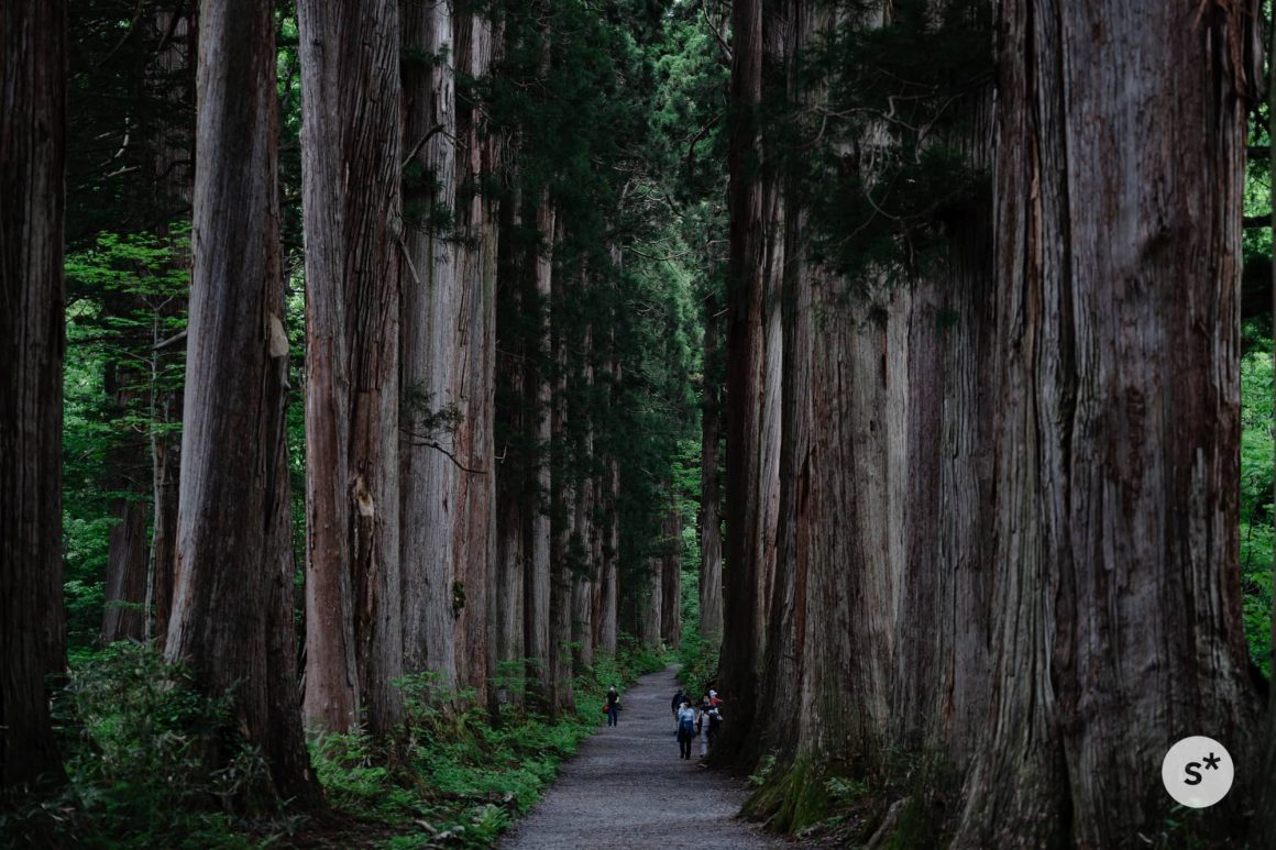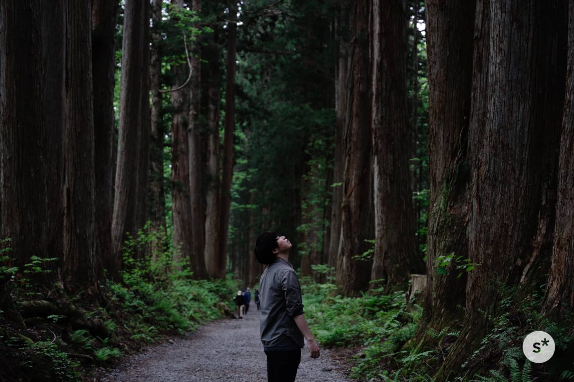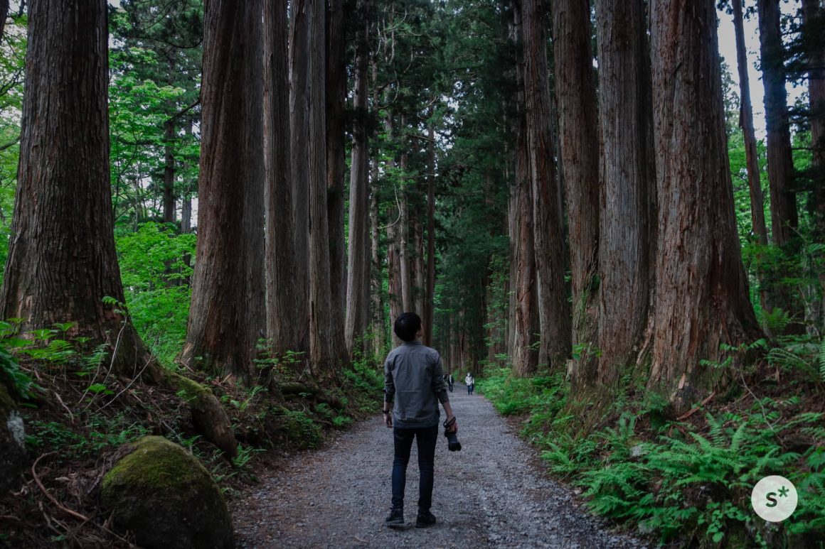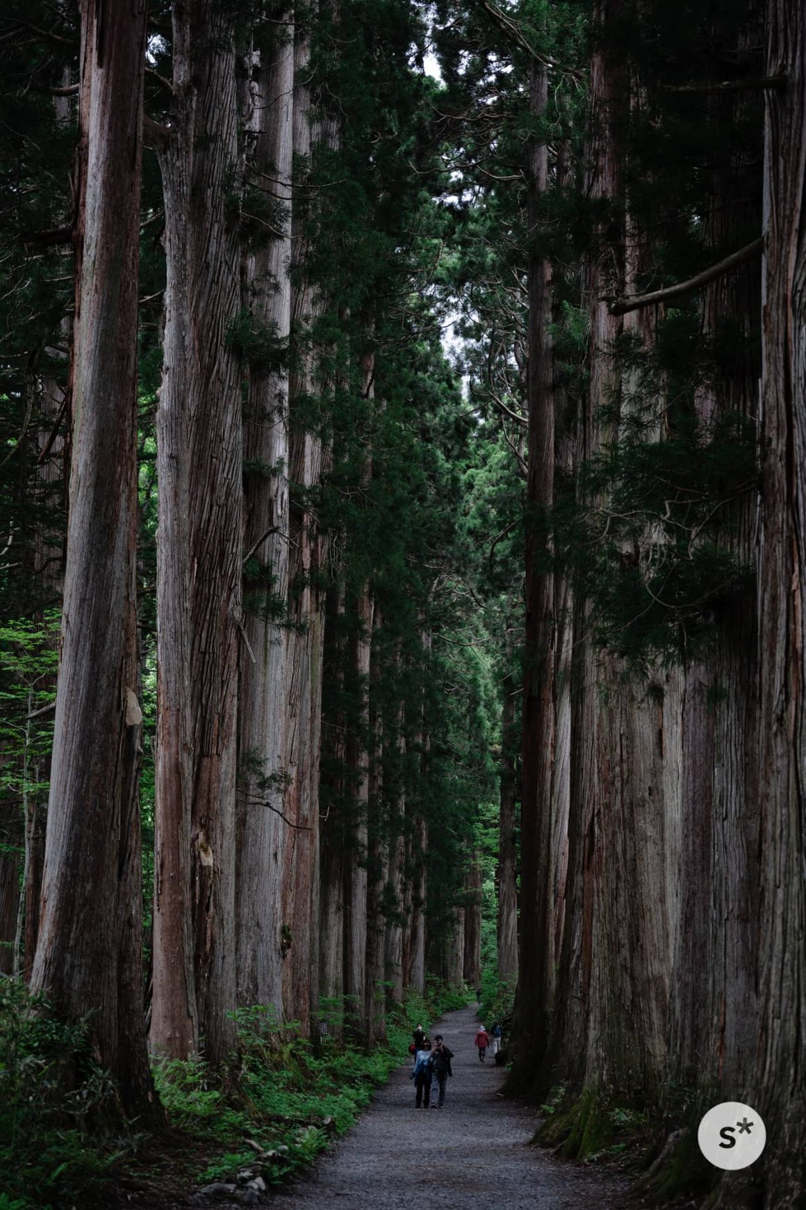 その参道の途中、約500mにわたって樹齢400年の杉並木が続いています。江戸時代に植えられたものだそうですが、今となっては見上げてもてっぺんが見えないほどに高く、横に並んだら人が小さく見えてしまうほどに太い。そんな木々が500mにわたってずーっと続いているのです。