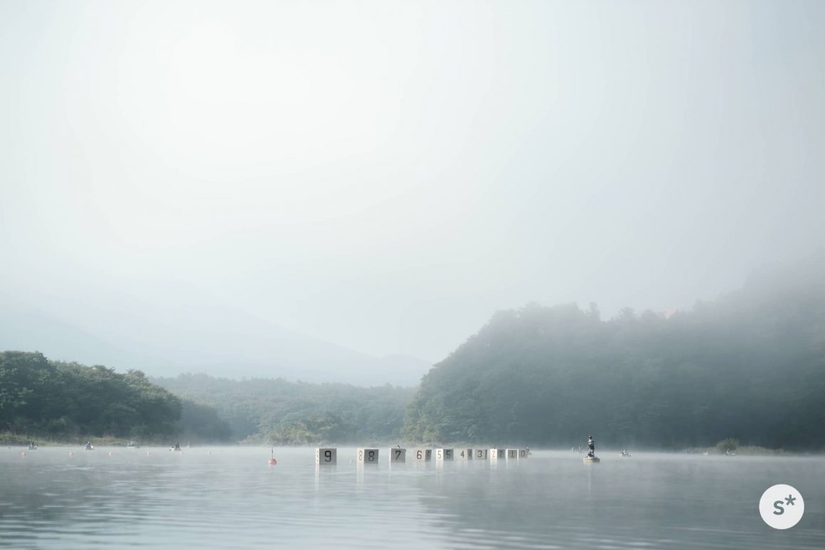 精進湖の夜明け 霧深い精進湖 身延山久遠寺 伊豆・大室山