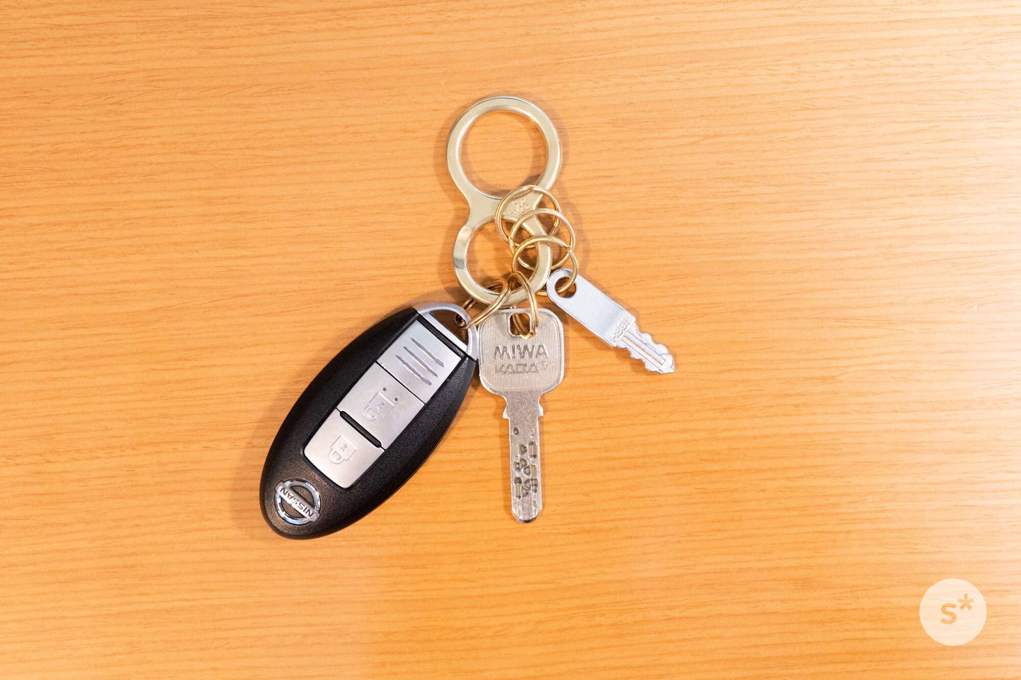 必要最低限の7つの円からなるキーホルダー。実際に僕が持ち歩いている鍵をつけてみましょう。