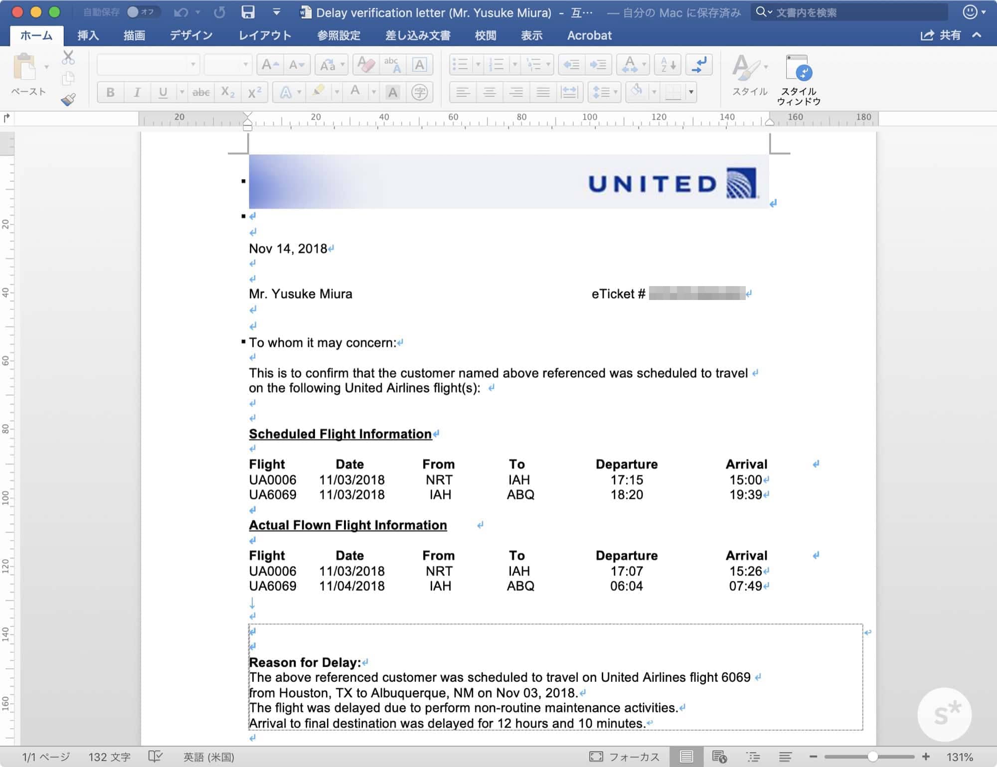 ちなみに、申請した便の直前に搭乗した成田→ヒューストン便も26分遅延したので、この証明書に記載されています。