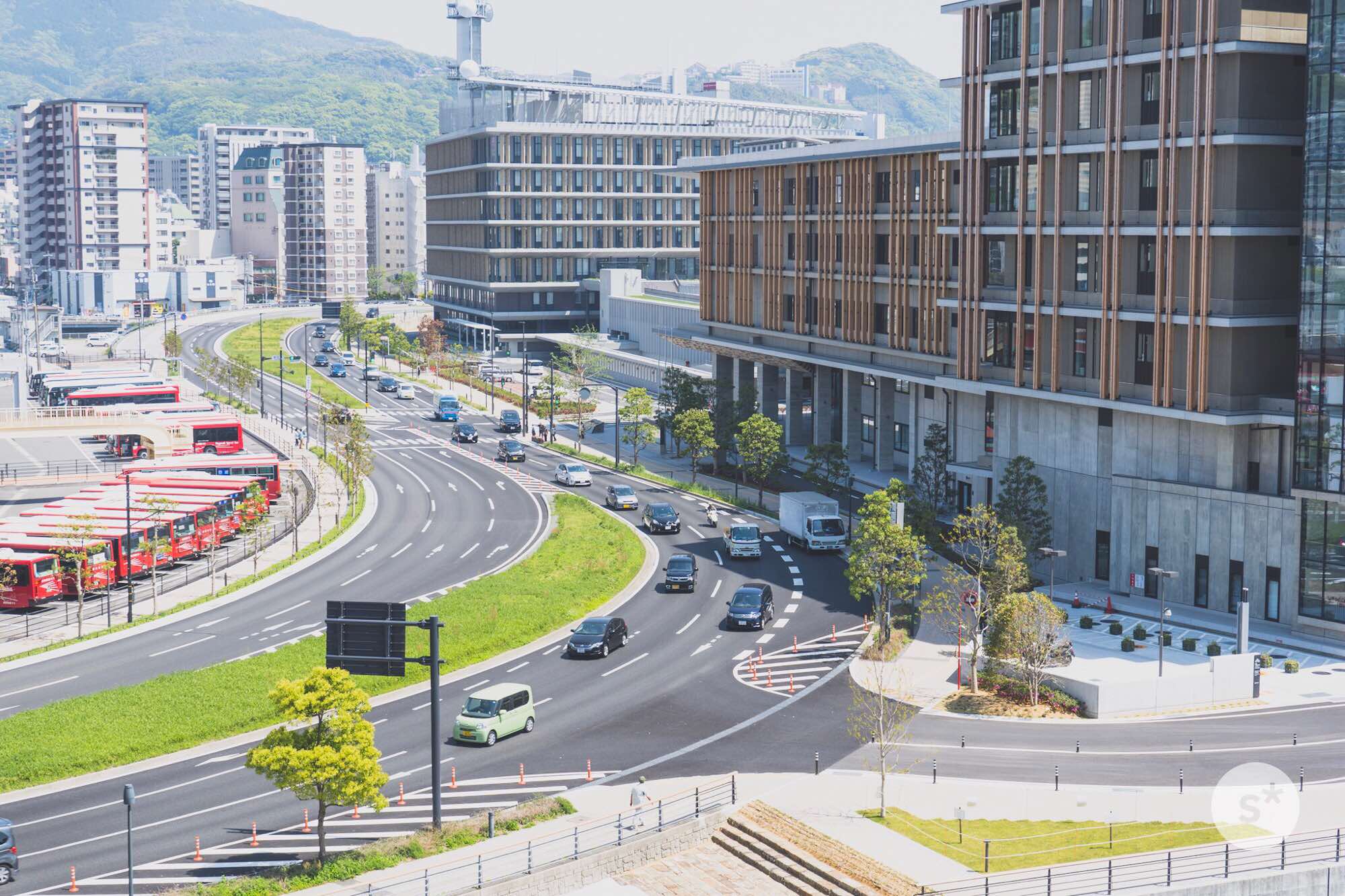 長崎駅から旭大橋の上まで登ってきました。被写体は移転したばかりの長崎県庁。緑が美しいですね。