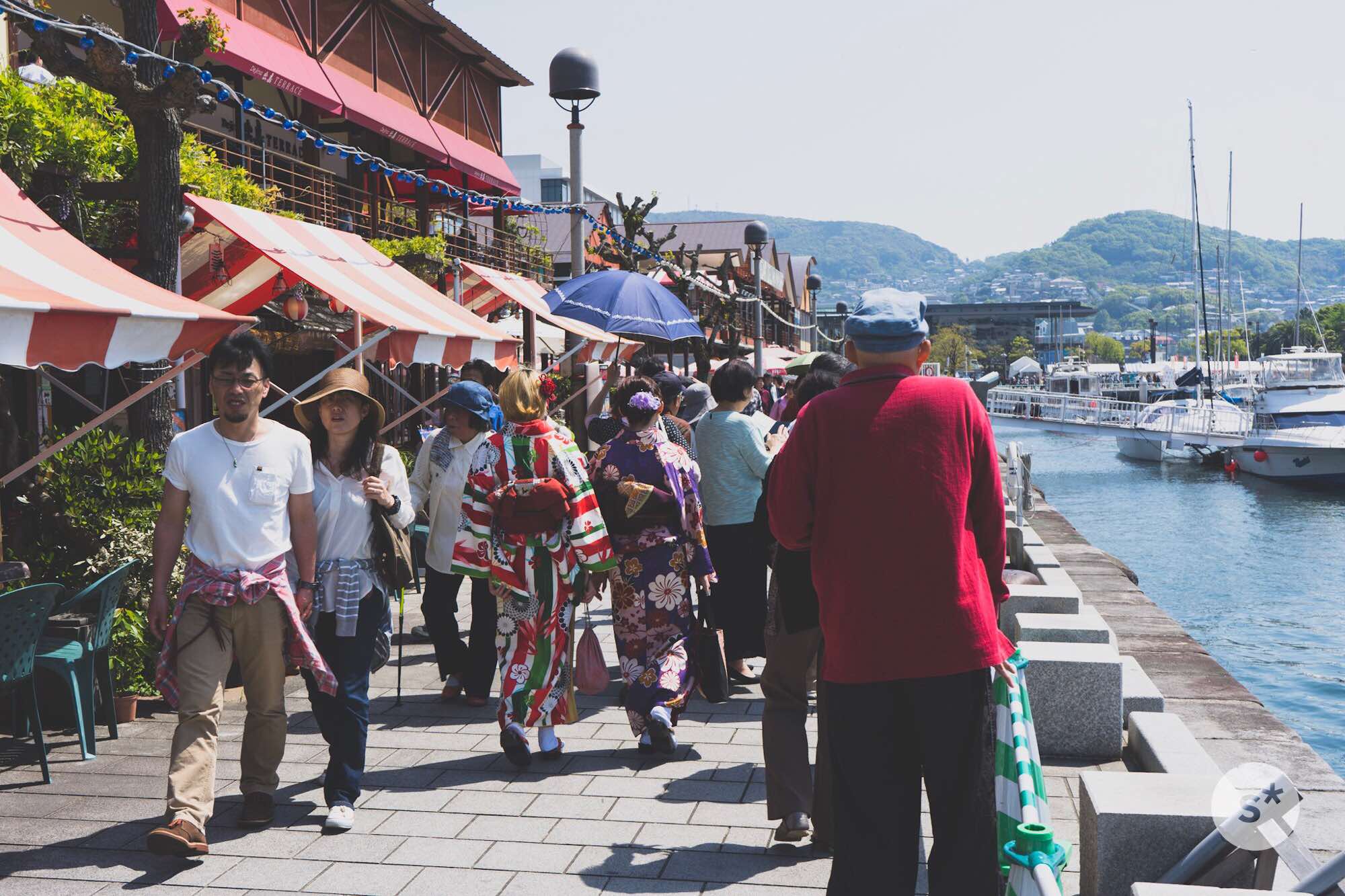 大波止方面へ。右奥の行列は「軍艦島クルーズ」に乗る人々。