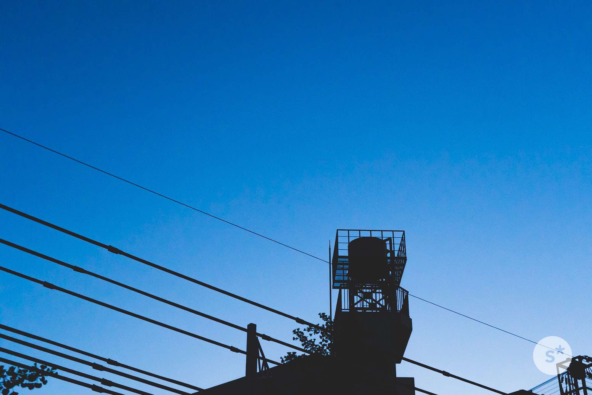 夕焼け空と建物。貯水タンク下の網の描写にも注目。