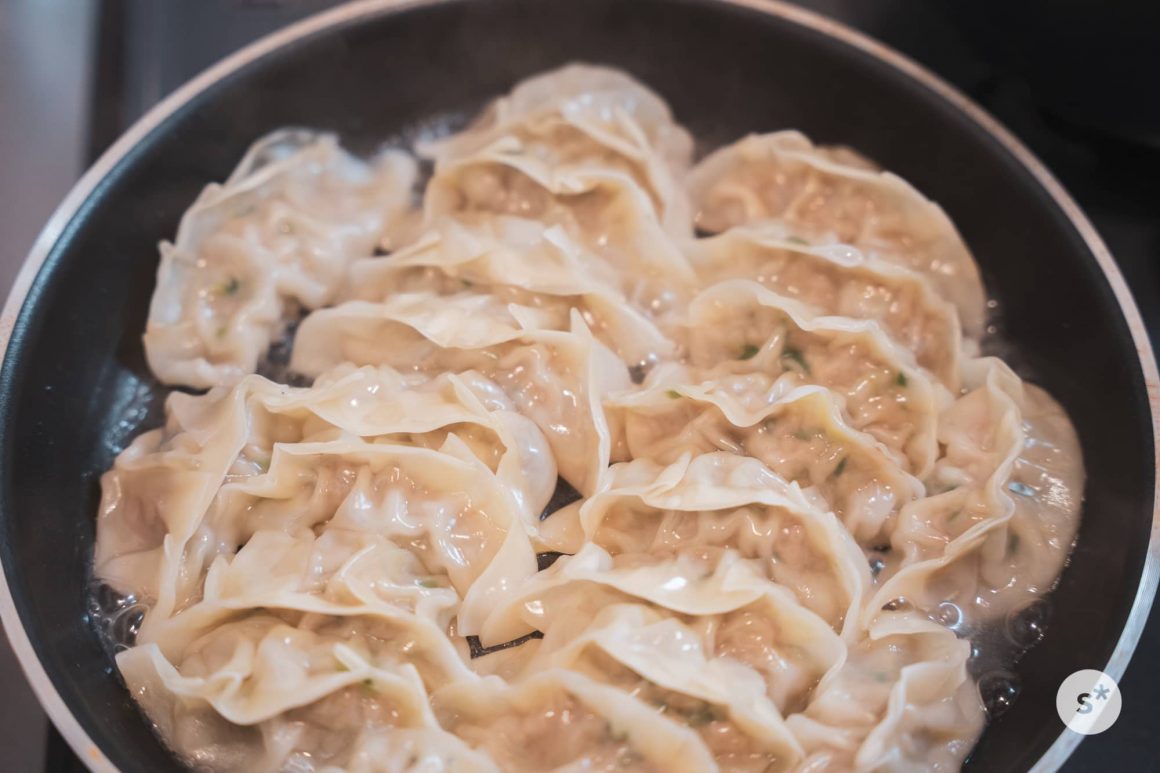フライパンにテキパキと並べ、強火で軽く焼け目をつけ、水を加えて蓋をして蒸し焼きにする。しばらくしてから蓋を取り、水分を完全に飛ばし、コマ油を入れてもう少し焼く。