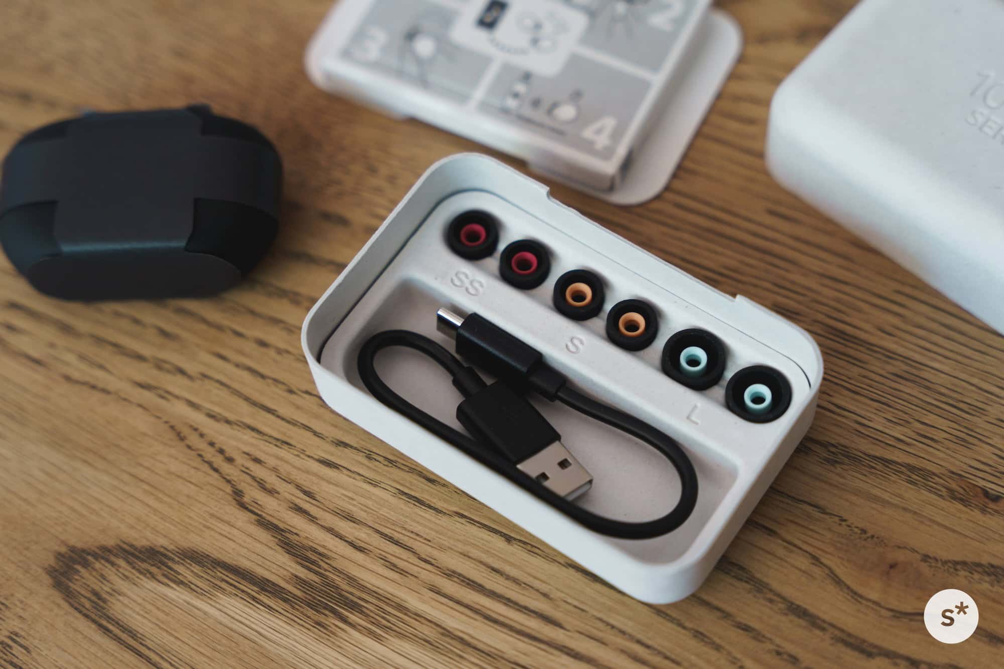付属品はとてもシンプルで、交換用のイヤーピースとUSBケーブル、それから説明書だけ。イヤーピースはMサイズが本体に装着されているので、全部で4サイズです。