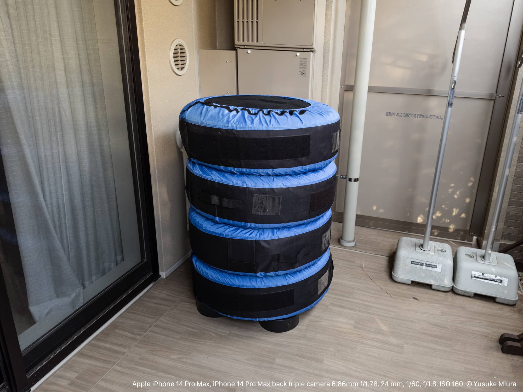 自宅のベランダが結構広いので、端っこにただ積み上げて保管しています。こんな感じで、湿気防止のために専用のタイヤパレットを敷いて、その上に重ねているだけです。