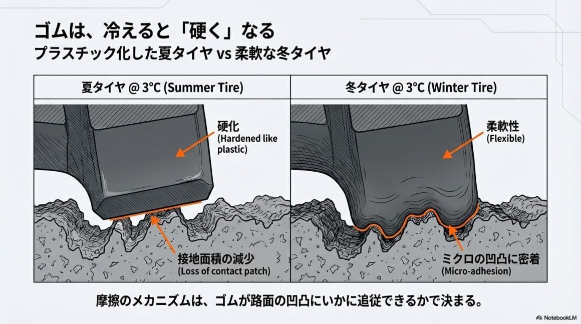 ゴムと路面の摩擦は、「滑る・滑らない」という二択の話ではありません。冬の低温状態ではゴムが硬くなり、路面をうまく掴めなくなる。だから夏タイヤは冬に向かない。これは、運転している人なら感覚的に分かる話だと思います。