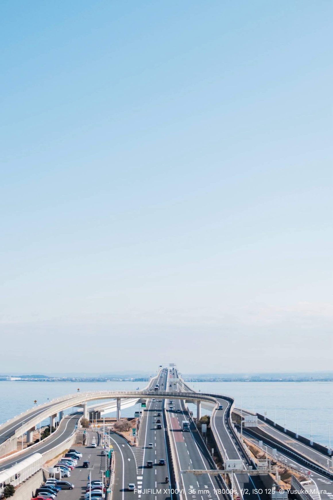 この写真、アクアラインの橋が先の方に延びてゆくのを際立たせるために、縦構図にするのが有効です。そのため、両サイドをばっさりとカットして、このような縦構図の写真に仕上げてみました。横構図の海が広がっている感じもいいけれども、アクアラインが目立つ縦構図もいいでしょ?