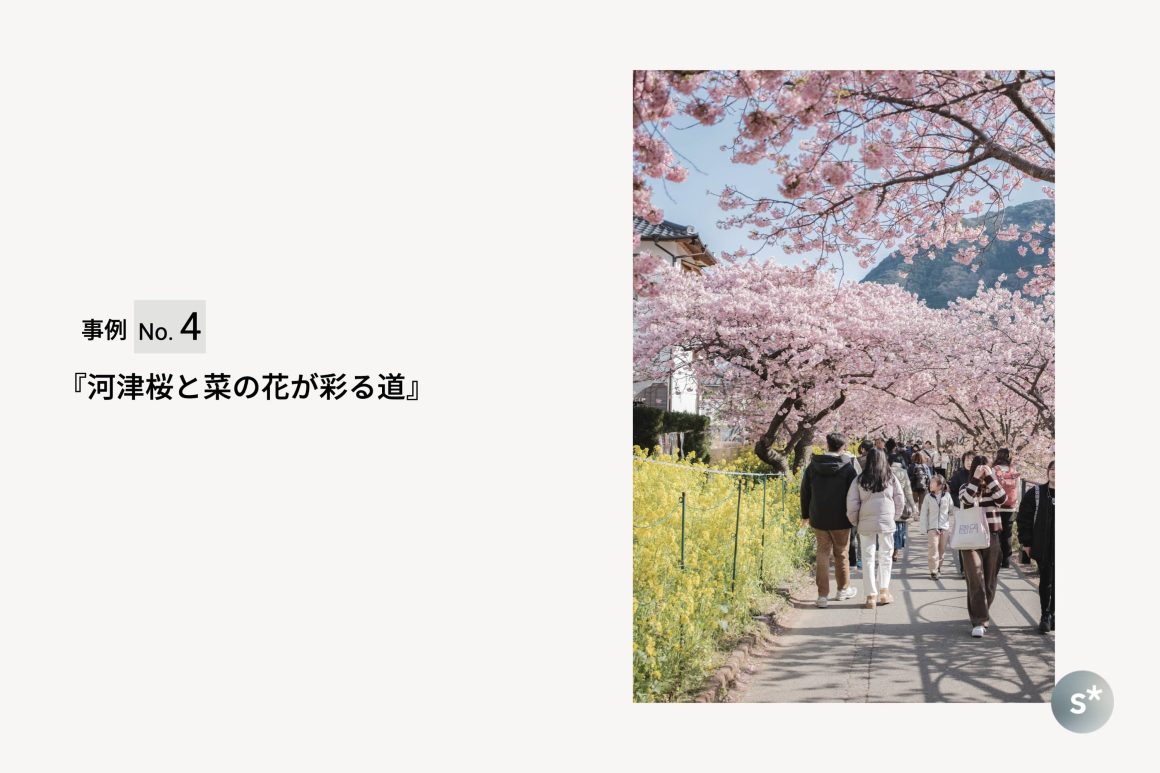 結果として、左側にしかない菜の花と上空の河津桜との対比が美しく、さらに通りの賑わい具合が明らかに伝わる写真になったように思います。