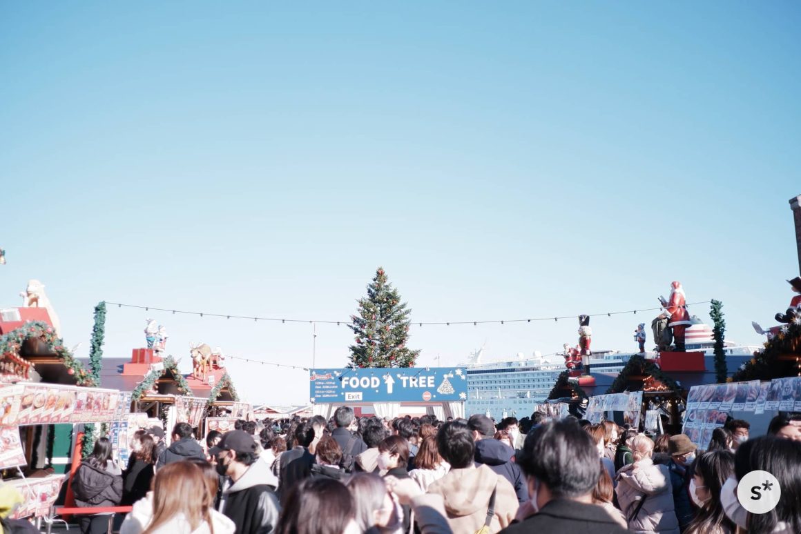 雑貨を売るエリアと食べ物を売るエリアが分かれていて、正面から入ったらまずは雑貨エリア、奥が食べ物エリアとなっています。そして、広場の中心には大きなクリスマスツリーがあります。