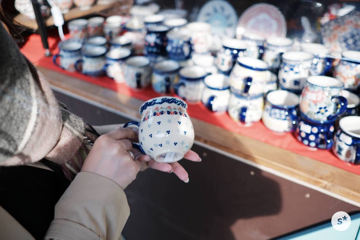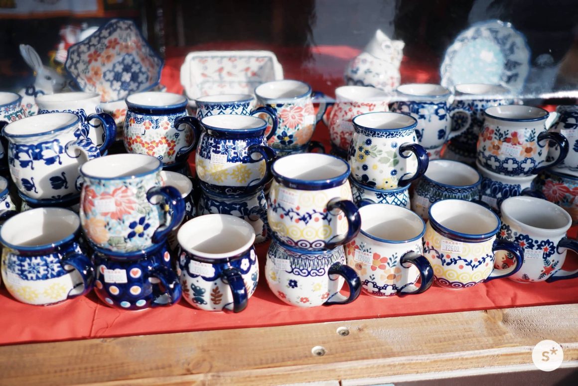 まず向かったのは、「Polish pottery shop」というポーランドのマグカップをたくさん売っているお店です。ポーランドの伝統的な模様が描かれたマグカップがたくさんありました。スタンプを押して模様を作るようで、気に入ったものがあったので1つ購入しました。