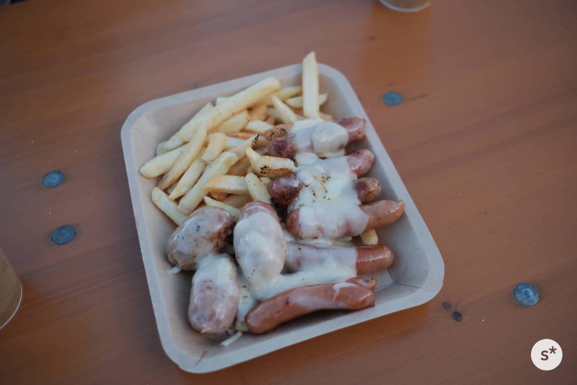 お腹が空いていたので「王様のホットワインとチーズのお店」でソーセージとホットワイン(ノンアルコール)を購入。ソーセージ自体ももちろん美味しいのですが、かかっているチーズが芳醇で絶品でした。ホットワインも最高。